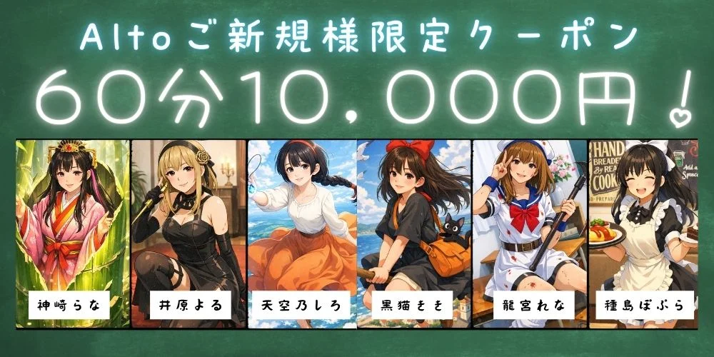 - Alto系列を初めてご利用されるお客様に限り 60分12,000円でご案内いたします❗️ 気になるあの子にお得に会えるコースをご活用いただき お気に入りのセラピストさんを見つけてください❗️